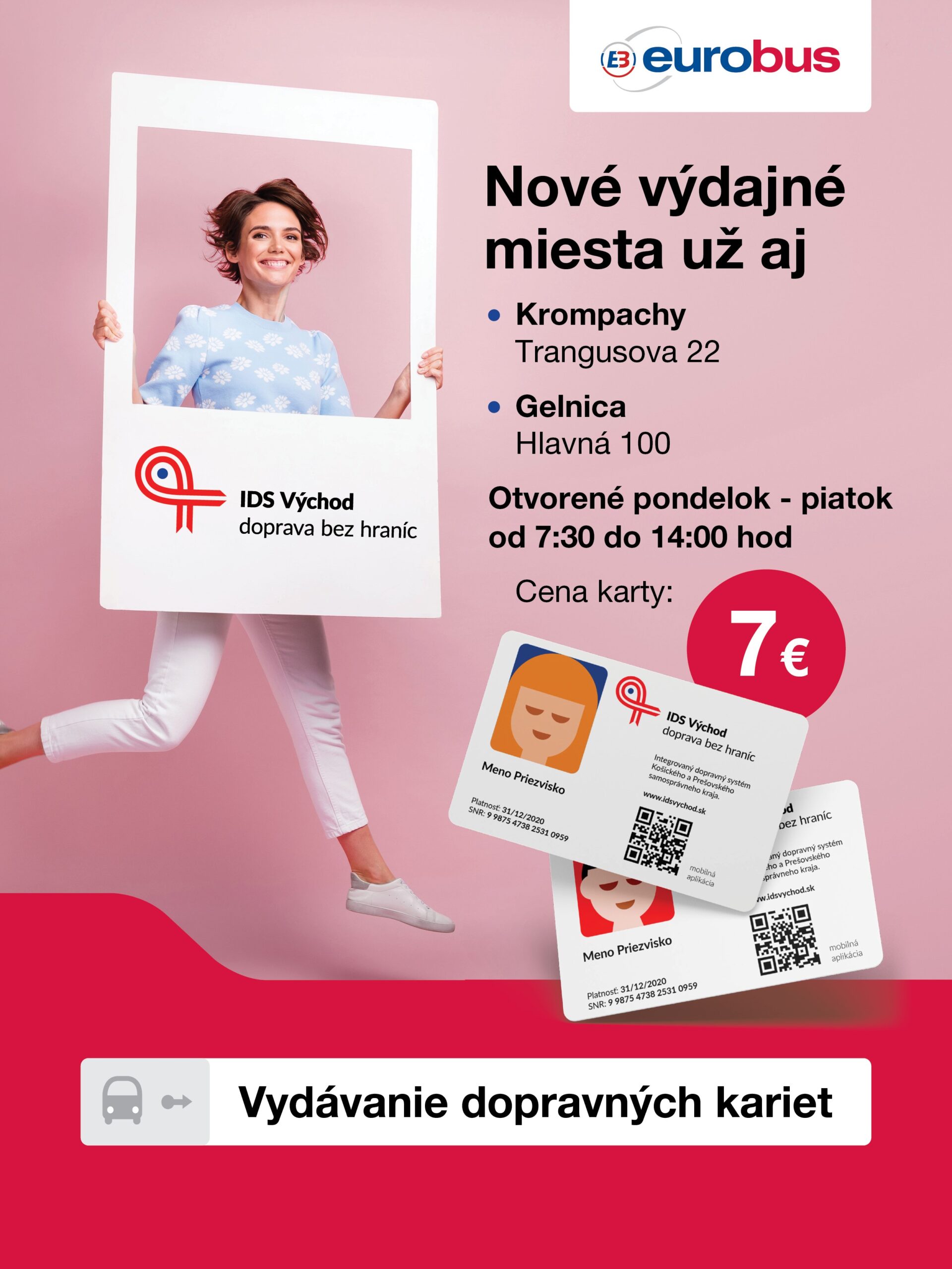 Spoločnosťou eurobus, a. s. informuje občanov o zriadením nového pracoviska v Krompachoch, kde si môžu cestujúci zakúpiť dopravnú kartu. Dopravné karty sa vydávajú na počkanie, pričom cestujúci so sebou nemusí priniesť vlastnú fotografiu, ale je odfotený na mieste.